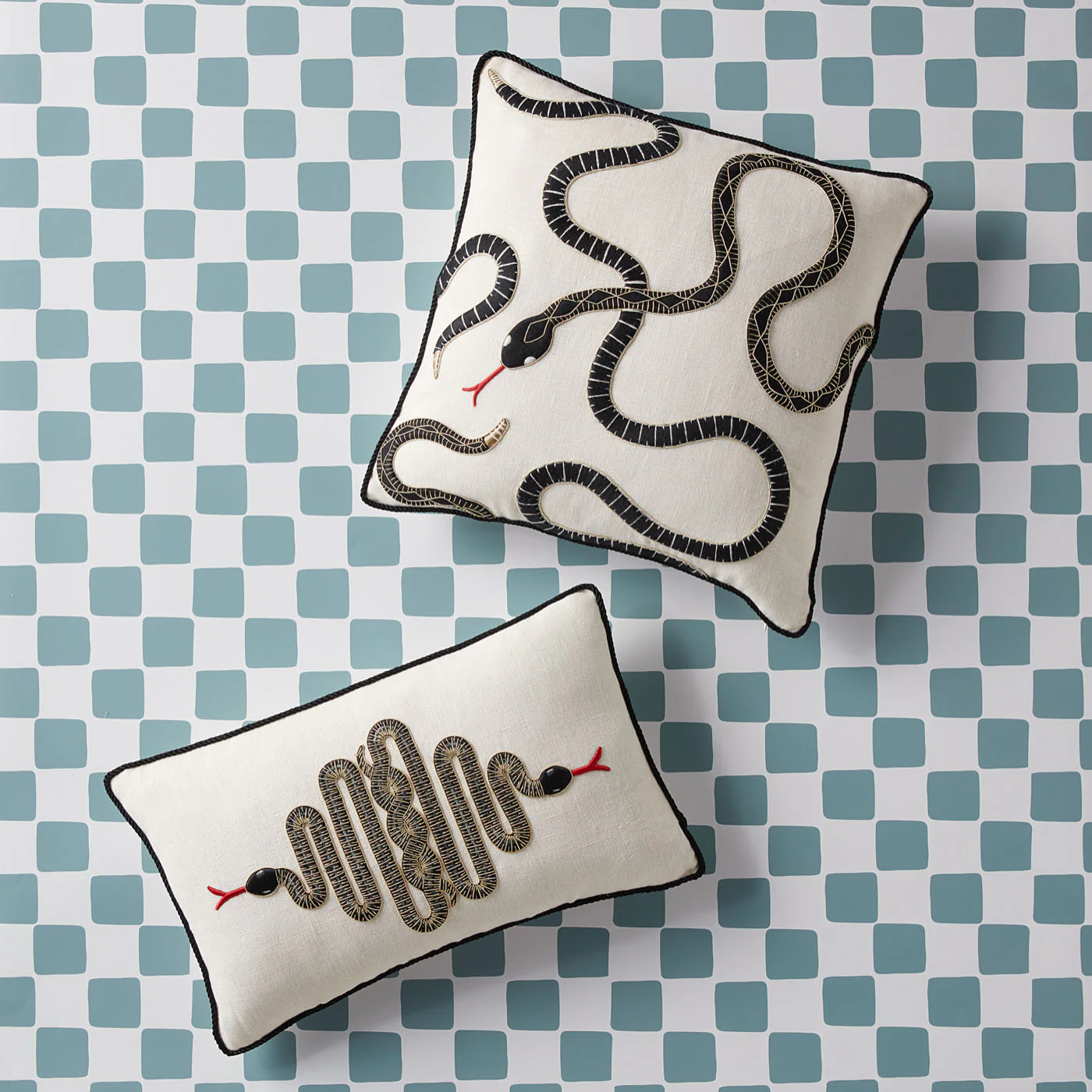 Hand-embroidered with a corded edge, our Eden pillow features our signature slithering serpent in classic black and ivory with a bold red tongue. Bring edgy glamour to any pillowscape, or perk up your reading chair with striking style.