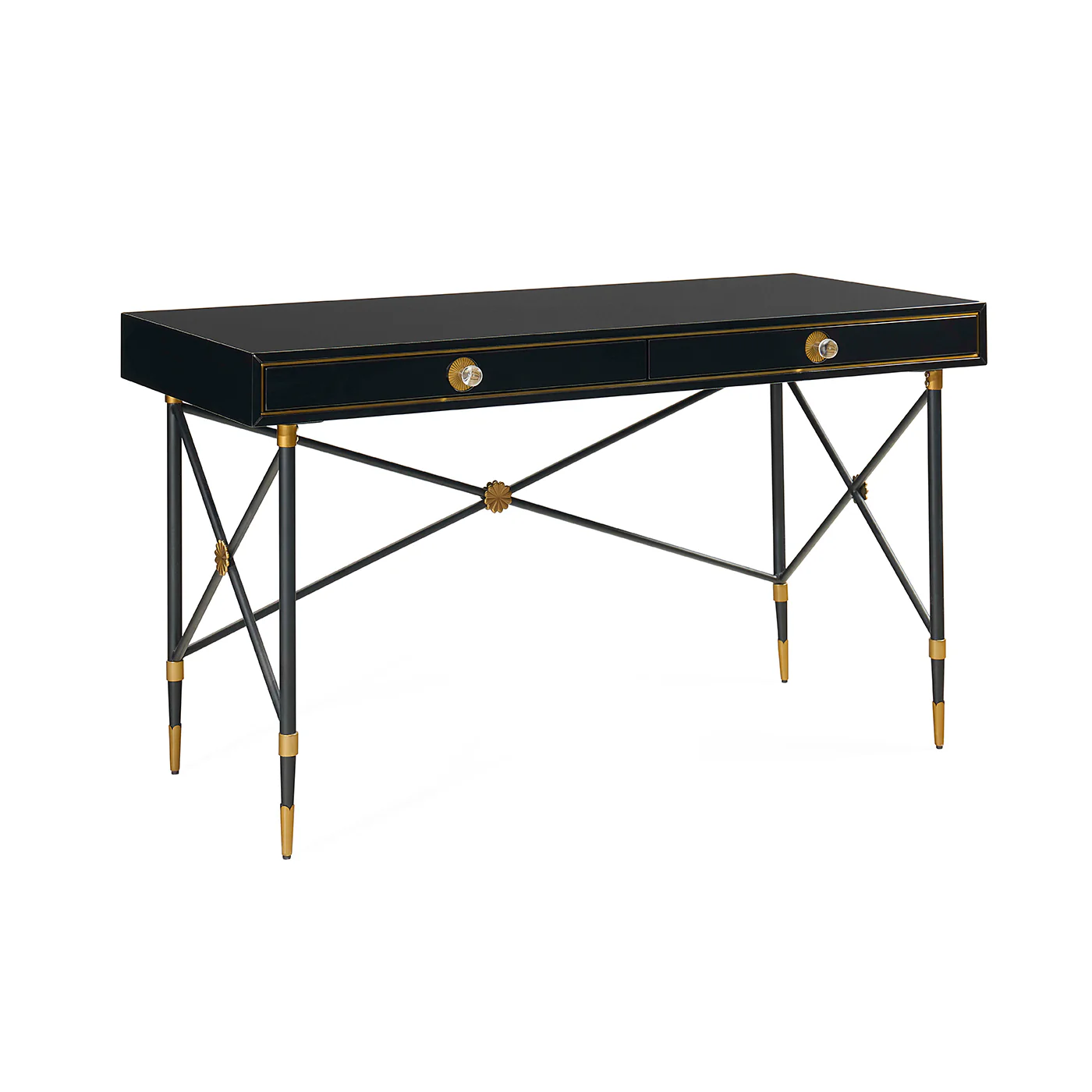 An updated take on French Empire style, our Rider Large Desk features a generously scaled black lacquer top and a blackened steel frame. Antique brass accents and luxe acrylic drawer pulls give every undertaking an elevated air. A decadent addition to any den or study. Featuring two drawers for stashing your bits and bobs.