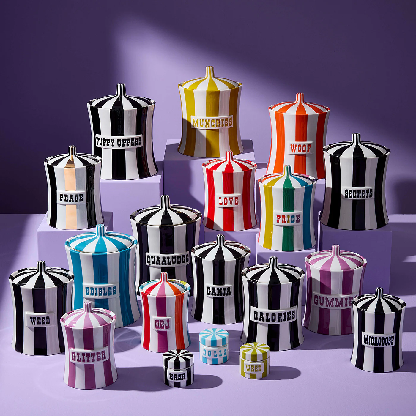 Celebrate life's little helpers. Our iconic canisters show off your indulgences, from sweets to sedatives, in irresistible hues: each high-fired porcelain canister is hand-painted with a graphic black and white or rich color finish. Cluster a few on your counter, keep one bedside for late-night cravings, or go wild and collect them all.